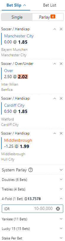 Oleh sebab itu jenis game ini disebut Mix Parlay atau taruhan berganda. Karena, jika bisa menebak semua taruhan dengan benar maka hadiah yang di terima seorang pemain juga akan berkali-kali lipat. Hal ini disebabkan semua odds yang terdapat di taruhan yang di pilih akan di kalikan semuanya, sehingga nilainya akan besar.